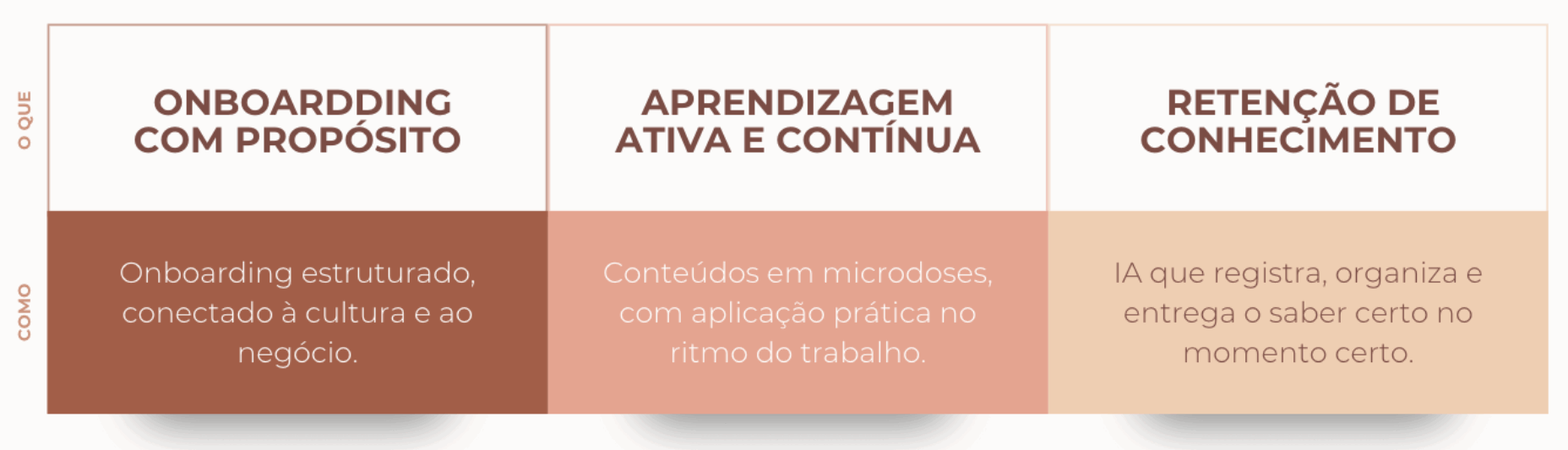 Somos especialistas em onboarding! Atuamos com treinamento e desenvolvimento por meio de uma metodologia própria de ensino e aprendizagem. Apoiamos organizações a engajar e desenvolver pessoas, transformando conhecimento em prática aplicada ao trabalho.